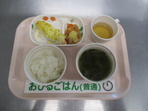ご飯、鮭のマヨコーンクリーム焼き、豚肉とじゅが芋のきんぴら、ほうれん草と玉ねぎの味噌汁