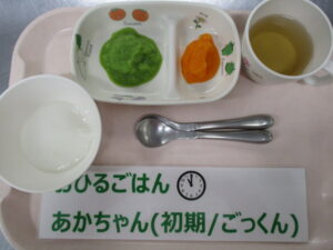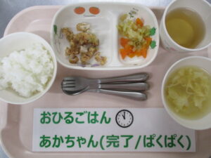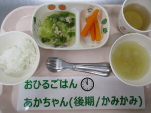 【後期食】軟飯、鶏ひき肉と白菜の煮物、人参スティック、玉ねぎの味噌汁