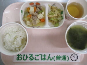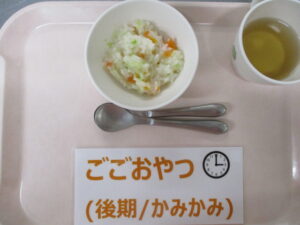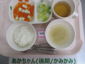 【後期食】軟飯、豆腐と人参の煮物、キャベツ煮、もやしの味噌汁
