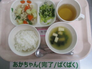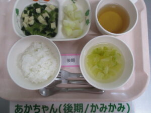 【後期食】軟飯、高野豆腐と小松菜の煮物、ジャガイモ煮、キャベツのスープ