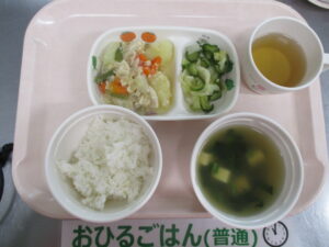 ご飯、塩鶏肉じゃが、キャベツのお浸し、小松菜と高野豆腐のスープ