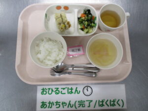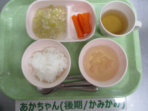 【後期食】軟飯、鶏ひき肉とキャベツの煮物、人参スティック、かぶのスープ