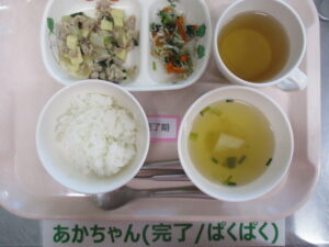 【後期食】軟飯、しらすと小松菜の煮物、じゃが芋煮、もやしのすまし汁