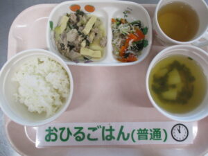 ご飯、豚肉と高野豆腐の味噌炒め、小松菜としらすの和え物、じゃが芋のすまし汁