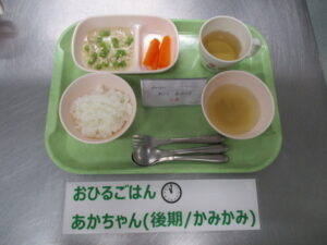 【後期食】軟飯、鶏ひき肉といんげんの煮物、人参スティック、もやしの味噌汁