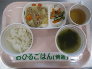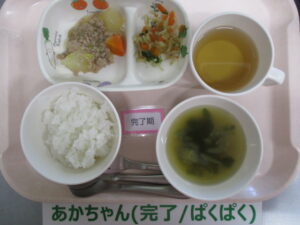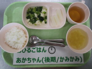 【後期食】軟飯、豆腐とチンゲン菜の煮物、、大根スティック、玉ねぎのスープ