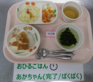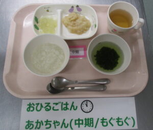 【中期食】パン粥、ツナとじゃがいもの煮物、玉ねぎ煮、ほうれん草のスープ
