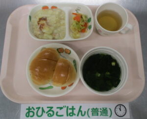 ロールパン、ポテトグラタン、ツナサラダ、小松菜とコーンのスープ