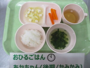 【後期食】軟飯、豆腐とキャベツの煮物、人参スティック、小松菜の味噌汁