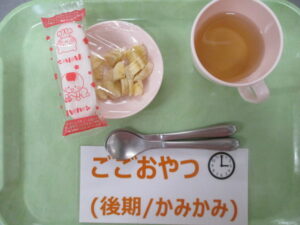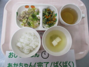 【中期食】五倍粥、豆腐とキャベツの煮物、人参スティック、小松菜の味噌汁