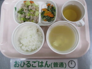 ご飯、豚肉と野菜の生姜焼き、切干大根のごま和え、豆腐の味噌汁