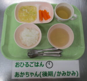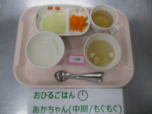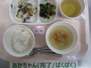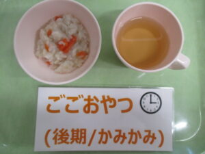 【中期食】五倍粥、カレイとキャベツの煮物、人参スティック、麩のすまし汁