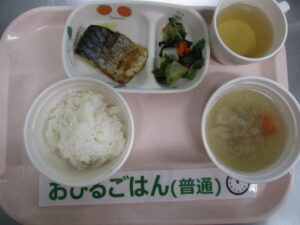 ご飯、鯖のカレー風味焼き、磯香和え、根菜汁