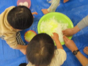今日はお部屋にブルーシートを敷いて雪遊び。おままごとで使っているお皿などを用意して遊んだり、冷たいのを我慢して一生懸命にお団子やおにぎりを作っているお友だちもいました。雪に少しだけ食紅を混ぜると「かきごおりだー!」と盛り上がり、季節外れのかき氷を楽しんでいる姿がとても可愛かったです!