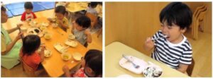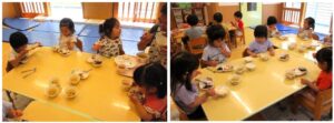 そして今日は幼児クラスのわくC組さんと秋葉台公園をぐるっとお散歩♪ その後はお給食タイムです。最近『〇〇パーティー』がだいすきなきらきら組のみんな。今日は『おにくパーティー』と名付けて、みんなで楽しくモリモリ!!たくさんのお友だちが完食しましたよ☺♪