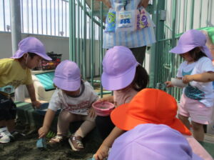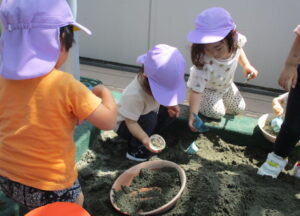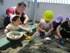 昨日は3階のテラスへ行き砂場遊びをしました。カップに砂を入れてプリンを作ったり、大きな平たい容器ではお誕生日ケーキを作り、ハッピーバースデーの曲を歌っては食べる真似をして楽しみました。