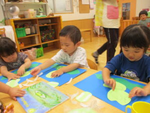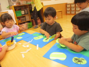 そらまめの裏に貼ってある両面テープに苦戦しつつも、眉間にシワを寄せながらも自分たちで両面テープを剥がして貼ることができました。
