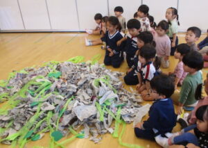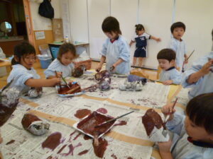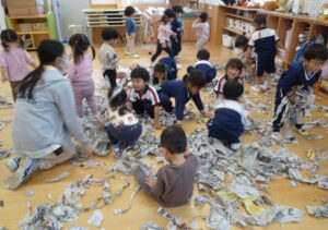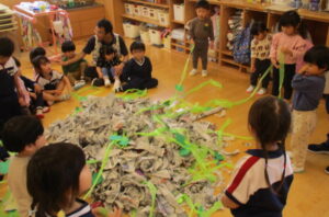 先日のさつまいもほりがとても楽しそうで羨ましく、やってみたい気持ちいっぱいになったC組さん。それならばと、半年後の畑デビューを前に、新聞紙のおいもづくりに挑戦です。