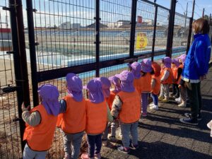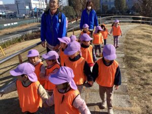 28日は暖かくて気持ちのいいお天気だったので、みんなで大好きなお散歩へ出かけました。公園を探検していると、「かけっこしたい!」「よーいどんしよう!」という元気な声が聞こえてきたので、広場に寄り道♪ 給食の時間までたっぷり走って遊びました。