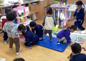 29日は異年齢交流。わくわくのおにいさんおねえさんが一緒だったので、ちょっぴりドキドキしているお友だちもいましたが、遊んでいるうちにすぐ仲良くなり、楽しい時間を過ごしました。