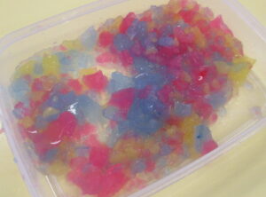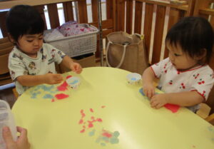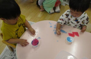 ヒンヤリ冷たい寒天、ダイナミックに握るお友だちや慎重にツンツンするお友だち。つるんと不思議な感触を楽しみました。