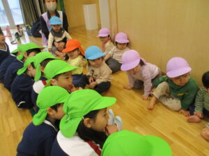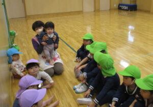 ぽかぽかさんがB組さんのお部屋に遊びに行ったことは何度かありましたが、一緒に活動をするのは初めてのこと。「お兄さんお姉さんたちとホールで遊ぶよ~」と声を掛けると、「わーい!」「やったー!」と大喜びのぽかぽかさんは張り切って準備開始!年上のお兄さんお姉さんに手をつないでもらってとても嬉しそうでした。