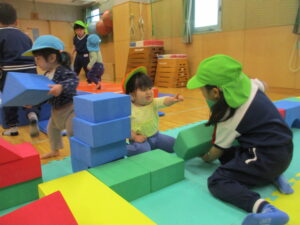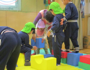 大きな積み木を運ぼうとするぽかぽかさんを見つけると、すぐに駆け寄り、『代わって』ではなく『力を合わせて一緒に』運んでくれたり、目線を合わせようとしゃがんで接してくれたりと、B組さんのやさしい姿と成長を見ることができ、保育者たちもとても嬉しくなりました。