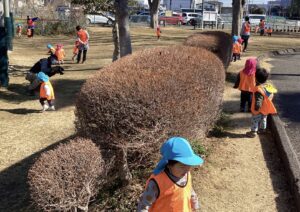 ▼おいかけっこに土の観察。石拾いにモグラ探し!転んでも、すぐに起きてまた遊び始めます!