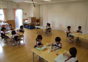 今日は7月の折り紙製作で「セミ」を作りました。製作前には、昆虫図鑑を用いてセミの種類や抜け殻の形、生息する時期や卵を産み付けるところから生涯を終えるまでのお話をしました。