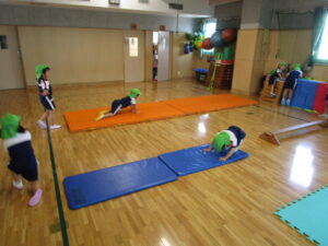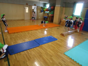 1)「ハイハイ」「ライオン歩き」「うさぎジャンプ」のいずれかをマットの上で。→ 2)平均台・・一人ずつ乗って落ちないように。→3)最後の青マットでは保育者の補助付きで前転または後転。