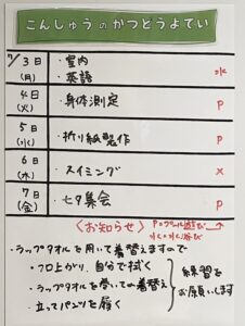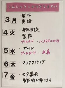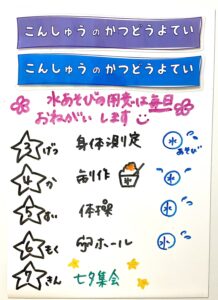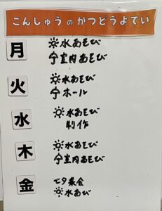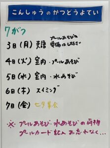 ◆◇1週間の予定◇◆7/3(月)~7/7(金) 2023/07/01 ※こちらに記載の予定は、天候や都合により変更になる場合がございます。ご承知おきください。 ※マチコミカレンダーで予定をご確認いただけます。あわせてご活用ください。 ========================= 【ぽかぽか組】 —————– 【きらきら組】 —————– 【わくわくC組】 —————– 【わくわくB組】 —————– 【わくわくA組】