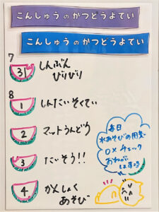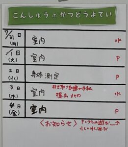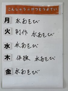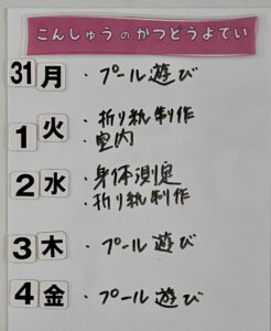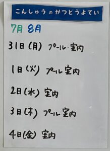 ◆◇1週間の予定◇◆7/31(月)~8/4(金) 2023/07/29 ※こちらに記載の予定は、天候や都合により変更になる場合がございます。ご承知おきください。 ※マチコミカレンダーで予定をご確認いただけます。あわせてご活用ください。 ========================= 【ぽかぽか組】 —————– 【きらきら組】 —————– 【わくわくC組】 —————– 【わくわくB組】 —————– 【わくわくA組】
