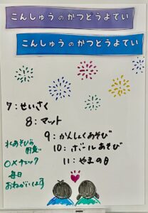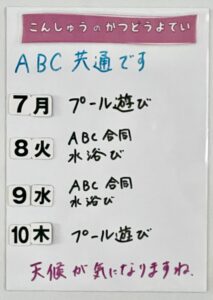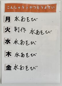 ◆◇1週間の予定◇◆8/7(月)~8/11(金) 2023/08/05 ※こちらに記載の予定は、天候や都合により変更になる場合がございます。ご承知おきください。 ※マチコミカレンダーで予定をご確認いただけます。あわせてご活用ください。 ========================= 【ぽかぽか組】 —————– 【きらきら組】 —————– 【わくわく組】ABC合同保育