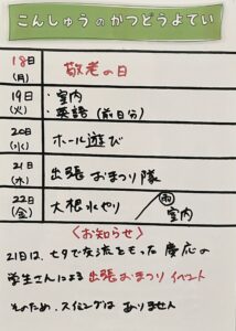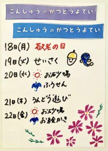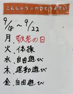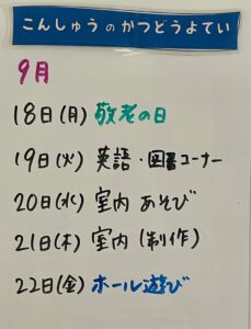◆◇1週間の予定◇◆9/18(月)~9/22(金) 2023/09/16 ※こちらに記載の予定は、天候や都合により変更になる場合がございます。ご承知おきください。 ※マチコミカレンダーで予定をご確認いただけます。あわせてご活用ください。 ========================= 【ぽかぽか組】 —————– 【きらきら組】 —————– 【わくわくC組】 —————– 【わくわくB組】 —————– 【わくわくA組】