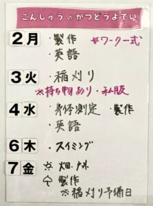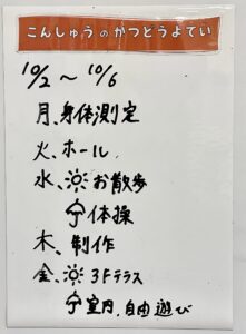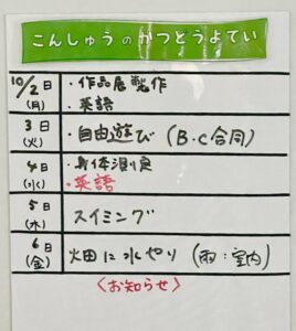 ◆◇1週間の予定◇◆10/2(月)~10/6(金) 2023/09/30 ※こちらに記載の予定は、天候や都合により変更になる場合がございます。ご承知おきください。 ※マチコミカレンダーで予定をご確認いただけます。あわせてご活用ください。 ========================= 【ぽかぽか組】 —————– 【きらきら組】 —————– 【わくわくC組】 ただいま準備中です —————– 【わくわくB組】 —————– 【わくわくA組】