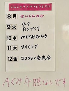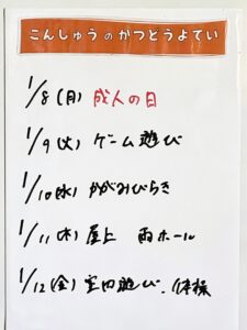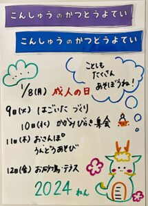 ◆◇1週間の予定◇◆1/9(火)~1/12(金) 2024/01/06 ※こちらに記載の予定は、天候や都合により変更になる場合がございます。ご承知おきください。 ※マチコミカレンダーで予定をご確認いただけます。あわせてご活用ください。 ========================= 【ぽかぽか組】 —————– 【きらきら組】 —————– 【わくわくC組】 —————– 【わくわくB組】 —————– 【わくわくA組】