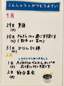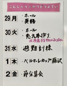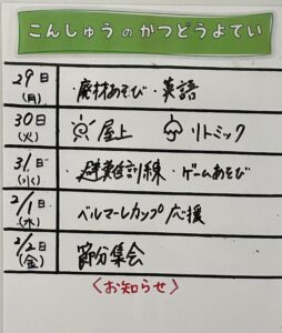 ◆◇1週間の予定◇◆1/29(月)~2/2(金) 2024/01/27 ※こちらに記載の予定は、天候や都合により変更になる場合がございます。ご承知おきください。 ※マチコミカレンダーで予定をご確認いただけます。あわせてご活用ください。 ========================= 【ぽかぽか組】 —————– 【きらきら組】 —————– 【わくわくC組】 —————– 【わくわくB組】 —————– 【わくわくA組】