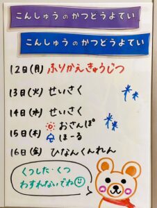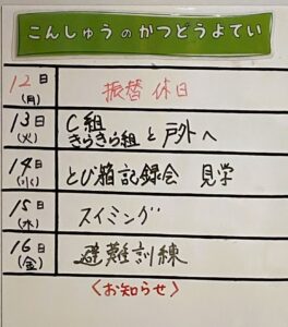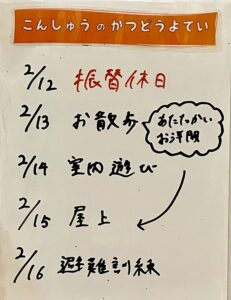 ◆◇1週間の予定◇◆2/12(火)~2/16(金) 2024/02/10 ※こちらに記載の予定は、天候や都合により変更になる場合がございます。ご承知おきください。 ※マチコミカレンダーで予定をご確認いただけます。あわせてご活用ください。 ========================= 【ぽかぽか組】 —————– 【きらきら組】 —————– 【わくわくC組】 —————– 【わくわくB組】 —————– 【わくわくA組】