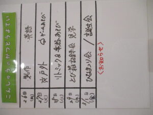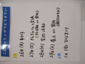◆◇1週間の予定◇◆2/26(月)~3/1(金) 2024/02/24 ※こちらに記載の予定は、天候や都合により変更になる場合がございます。ご承知おきください。 ※マチコミカレンダーで予定をご確認いただけます。あわせてご活用ください。 ========================= 【ぽかぽか組】 —————– 【きらきら組】 ただいま準備中です —————– 【わくわくC組】 —————– 【わくわくB組】 —————– 【わくわくA組】