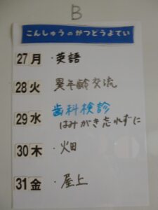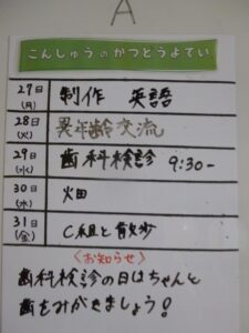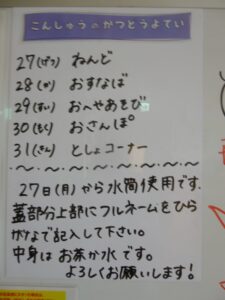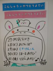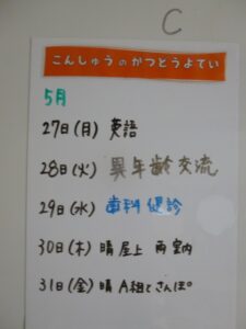 ◆◇1週間の予定◇◆5/27(月)~5/31(金) 2024/05/25 ※こちらに記載の予定は、天候や都合により変更になる場合がございます。ご承知おきください。 ※マチコミカレンダーで予定をご確認いただけます。あわせてご活用ください。 ========================= 【ぽかぽか組】 —————– 【きらきら組】 —————– 【わくわくC組】 —————– 【わくわくB組】 —————– 【わくわくA組】