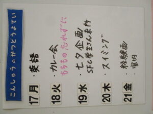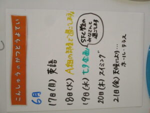 ◆◇1週間の予定◇◆6/17(月)~6/21(金) 2024/06/15 ※こちらに記載の予定は、天候や都合により変更になる場合がございます。ご承知おきください。 ※マチコミカレンダーで予定をご確認いただけます。あわせてご活用ください。 ========================= 【ぽかぽか組】 —————– 【きらきら組】 【準備中】 —————– 【わくわくC組】 —————– 【わくわくB組】 —————– 【わくわくA組】