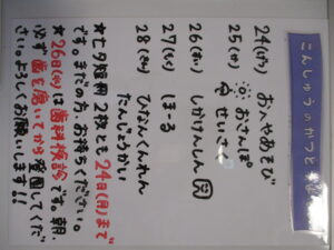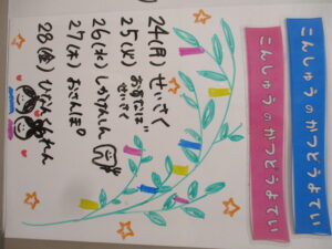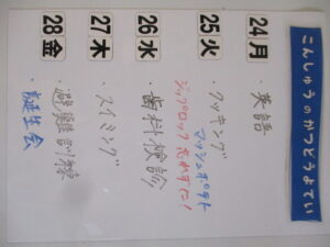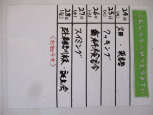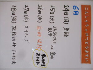 ◆◇1週間の予定◇◆6/24(月)~6/28(金) 2024/06/22 ※こちらに記載の予定は、天候や都合により変更になる場合がございます。ご承知おきください。 ※マチコミカレンダーで予定をご確認いただけます。あわせてご活用ください。 ========================= 【ぽかぽか組】 —————– 【きらきら組】 —————– 【わくわくC組】 —————– 【わくわくB組】 –————— 【わくわくA組】