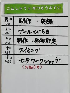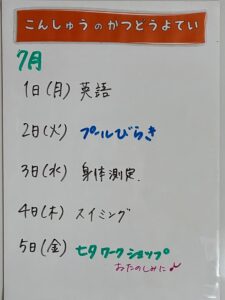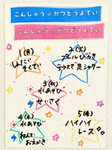 ◆◇1週間の予定◇◆7/1(月)~7/5(金) 2024/06/29 ※こちらに記載の予定は、天候や都合により変更になる場合がございます。ご承知おきください。 ※マチコミカレンダーで予定をご確認いただけます。あわせてご活用ください。 ========================= 【ぽかぽか組】 —————– 【きらきら組】 —————– 【わくわくC組】 —————– 【わくわくB組】 —————- 【わくわくA組】