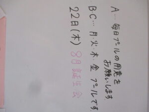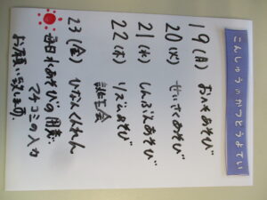 ◆◇1週間の予定◇◆8/19(月)~8/23(金) 2024/08/19 ※こちらに記載の予定は、天候や都合により変更になる場合がございます。ご承知おきください。 ※マチコミカレンダーで予定をご確認いただけます。あわせてご活用ください。 ========================= 【ぽかぽか組】 —————– 【きらきら組】 —————– 【わくわくABC組】