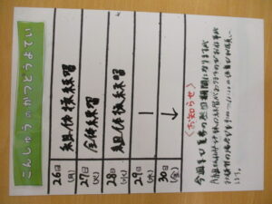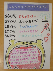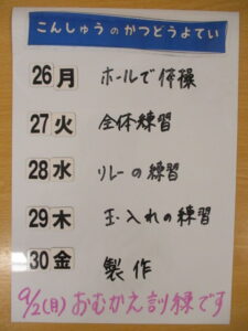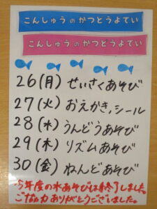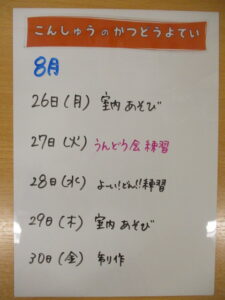 ◆◇1週間の予定◇◆8/26(月)~8/30(金) 2024/08/24 ※こちらに記載の予定は、天候や都合により変更になる場合 がございます。ご承知おきください。 ※マチコミカレンダーで予定をご確認いただけます。あわせ てご活用ください。 =================== 【ぽかぽか組】 _________ 【きらきら組】 _________ 【わくわくC組】 _________ 【わくわくB組】 _________ 【わくわくA組】