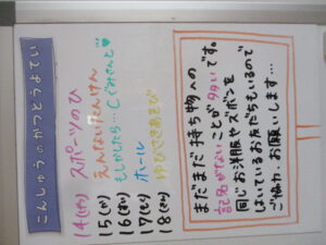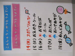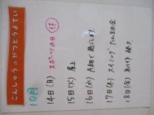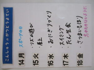 ◆◇1週間の予定◇◆10/14(月)~10/18(金) 2024/10/12 ※こちらに記載の予定は、天候や都合により変更になる場合がございます。ご承知おきください。 ※マチコミカレンダーで予定をご確認いただけます。あわせてご活用ください。 =================== 【ぽかぽか組】 ---------- 【きらきら組】 ---------- 【わくわくC組】 ---------- 【わくわくB組】 ---------- 【わくわくA組】