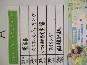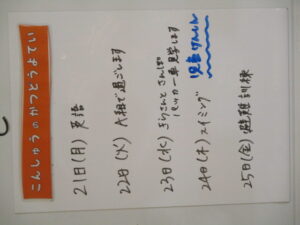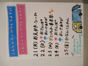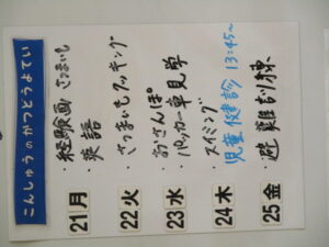 ◆◇1週間の予定◇◆10/21(月)~10/25(金) 2024/10/21 ※こちらに記載の予定は、天候や都合により変更になる場合がございます。ご承知おきください。 ※マチコミカレンダーで予定をご確認いただけます。あわせてご活用ください。 =================== 【ぽかぽか組】 ---------- 【きらきら組】 ---------- 【わくわくC組】 ---------- 【わくわくB組】 ---------- 【わくわくA組】