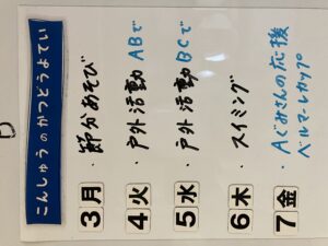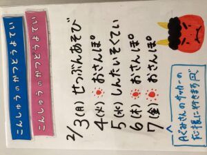◆◇1週間の予定◇◆2/3(月)~2/7(金) 2025/02/01 ※こちらに記載の予定は、天候や都合により変更になる場合がございます。ご承知おきください。 ※マチコミカレンダーで予定をご確認いただけます。あわせてご活用ください。 ==================== 【ぽかぽか組】 —————————— 【きらきら組】 —————————— 【わくC組】 —————————— 【わくB組】 —————————— 【わくA組】
