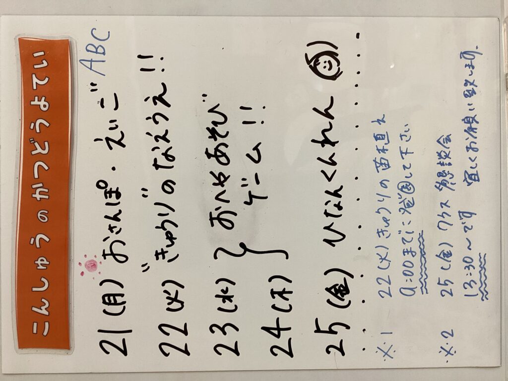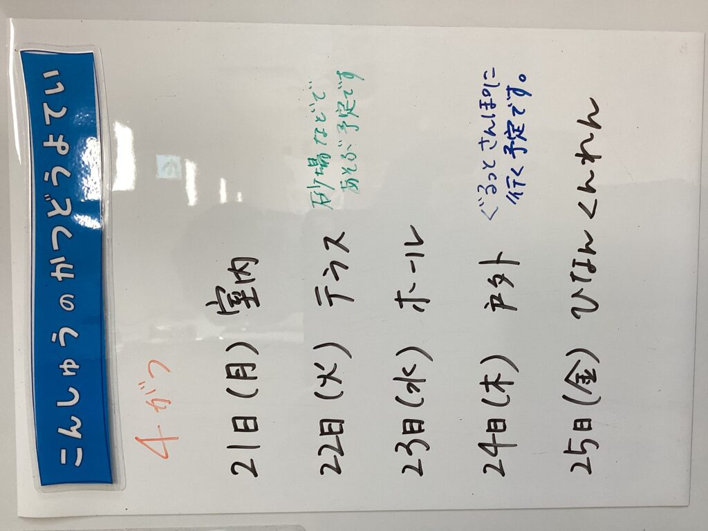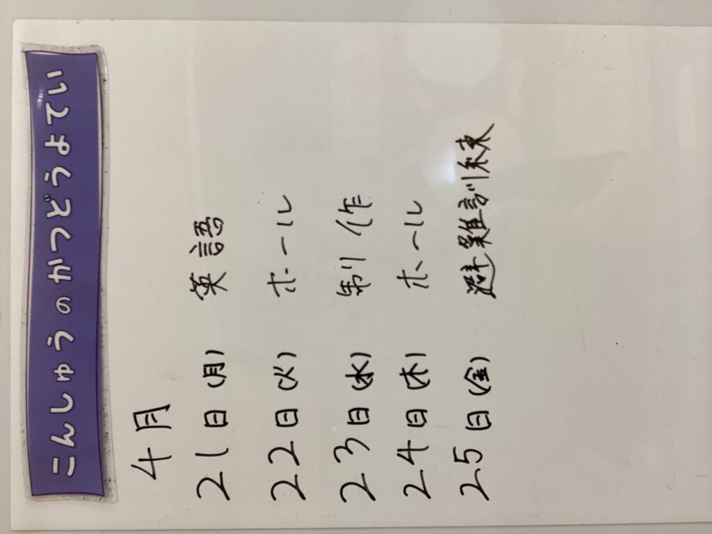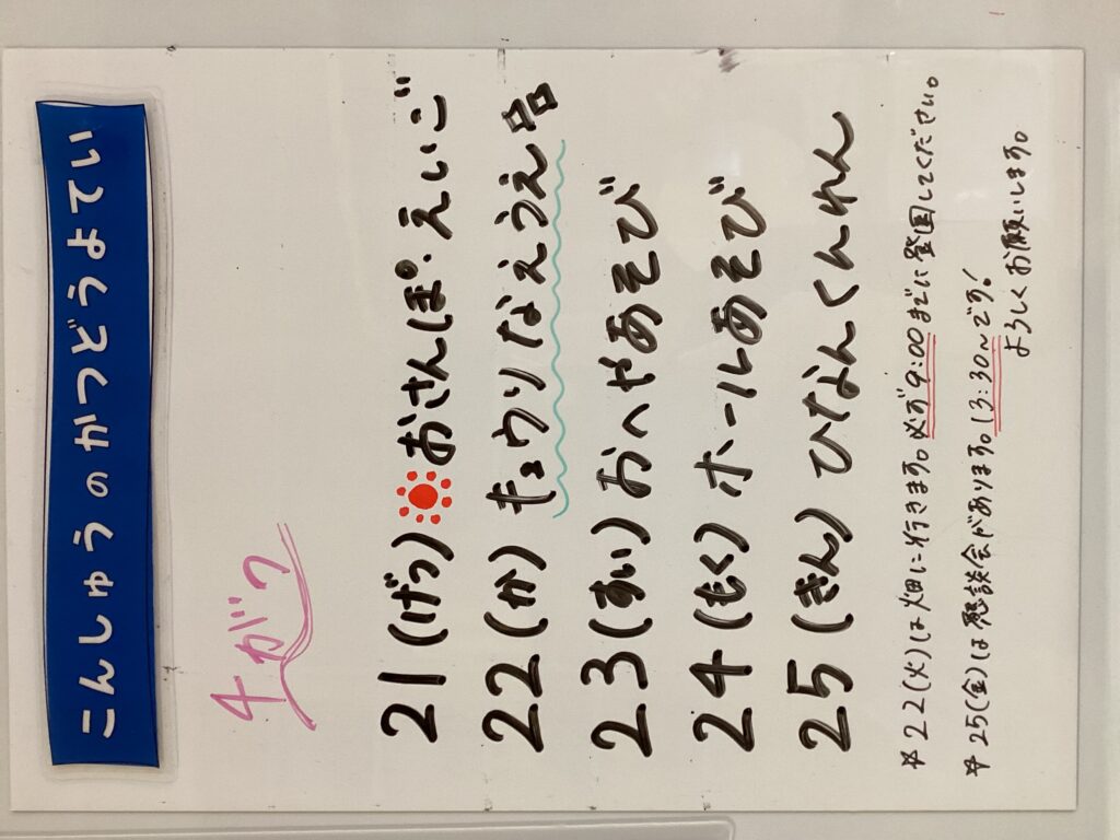 ◆◇1週間の予定◇◆4/21(月)~4/25(金) 2025/04/21 ※こちらに記載の予定は、天候や都合により変更になる場合がございます。ご承知おきください。 ※コドモンで予定をご確認いただけます。あわせてご活用ください。 =================== 【ぽかぽか】 準備中 —————————————- 【きらきら】 —————————————- 【わくC】 —————————————- 【わくB】 —————————————- 【わくA】