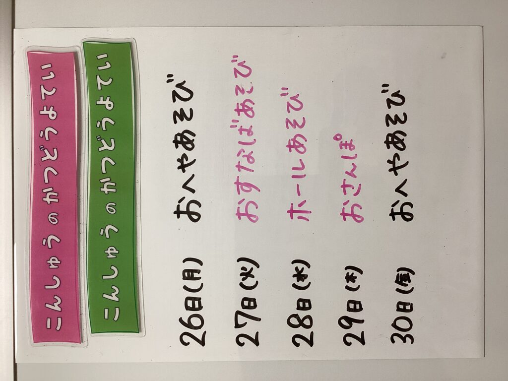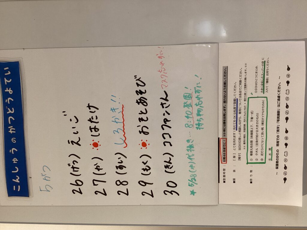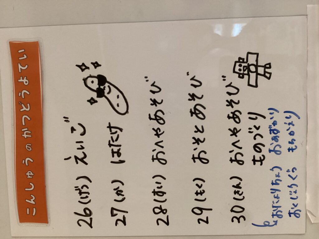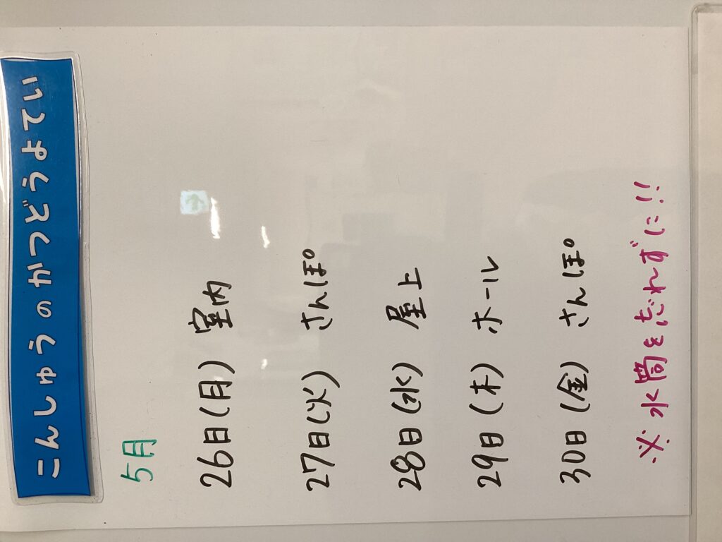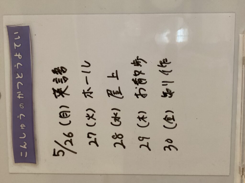 ◆◇1週間の予定◇◆5/26(月)~5/30(金) 2025/05/24 ※こちらに記載の予定は、天候や都合により変更になる場合がございます。ご承知おきください。 ※コドモンで予定をご確認いただけます。あわせてご活用ください。 ================================ 【ぽかぽか】 【きらきら】 【わくC】 【わくB】 【わくA】